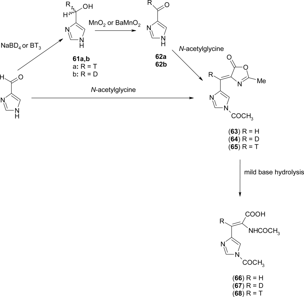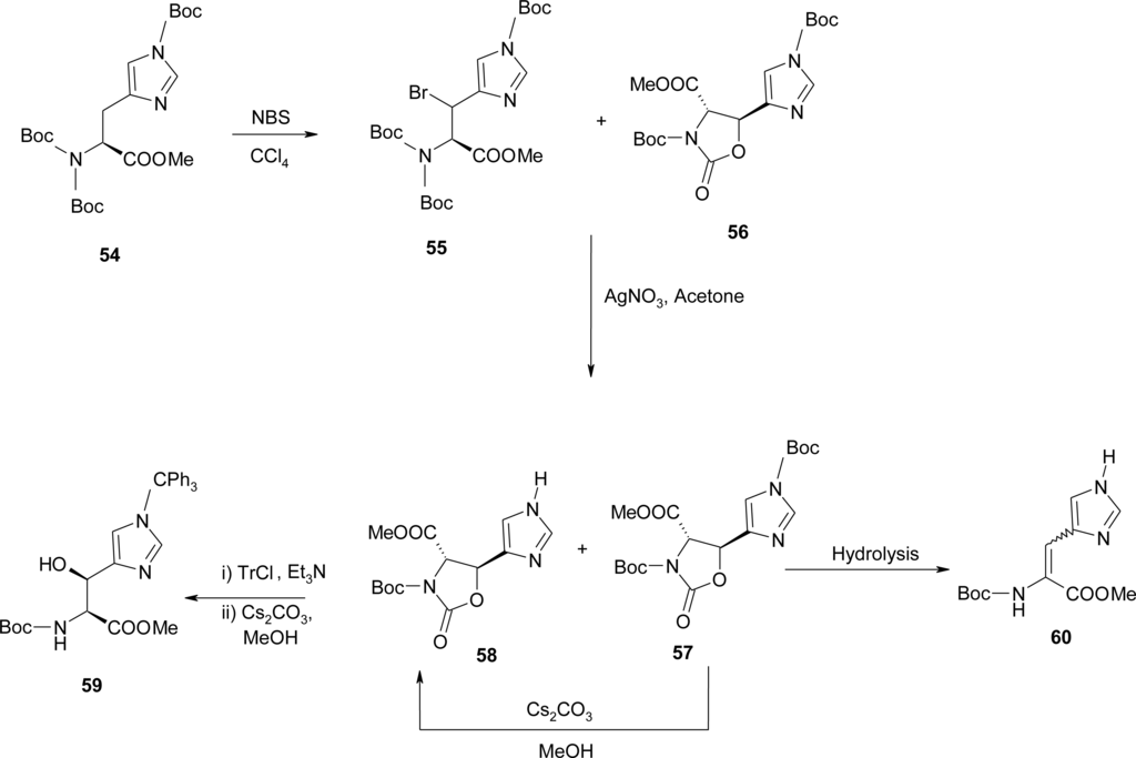 Crich et al. [] reported the use of N,N-di-tert-butoxycarbonyl protected amino acids in Easton’s protocol and the advantages that this strategy affords to the synthesis of α,β-dehydrohistidine and β-hydroxyhistidine (Scheme 13).