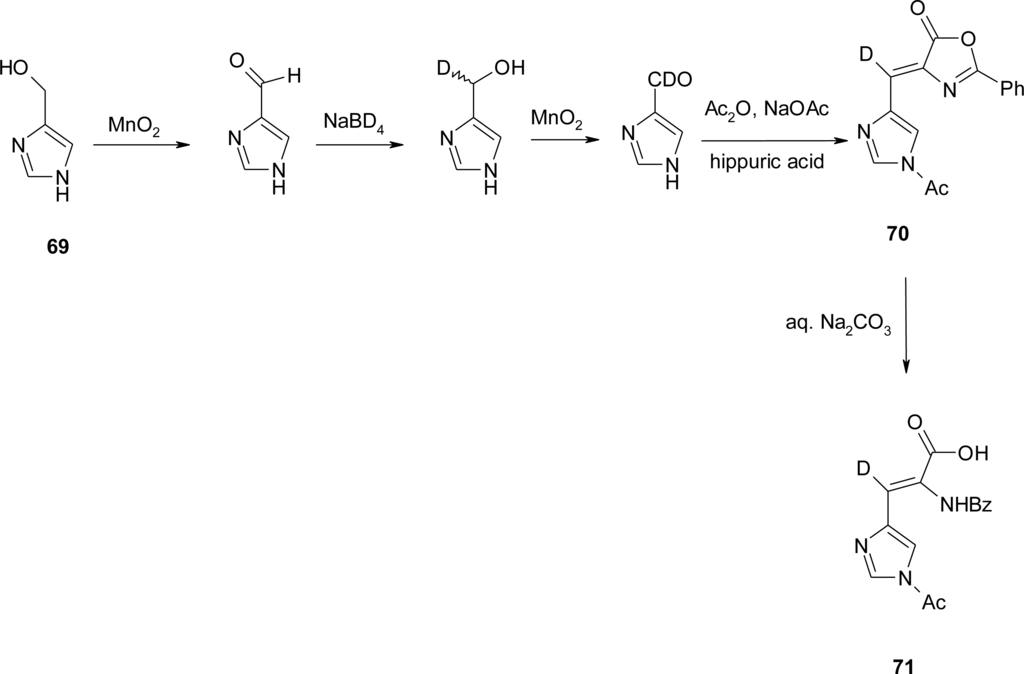 An attractive pathway to ACC 53 appears the addition of diazomethane to 4-[(1-acetyl-4-imidazolyl)methyl-ene]-2-phenyl-2-oxazolin-5-one 51 followed by hydrolytic cleavage of the oxazolone ring 52 [] (Scheme 12).