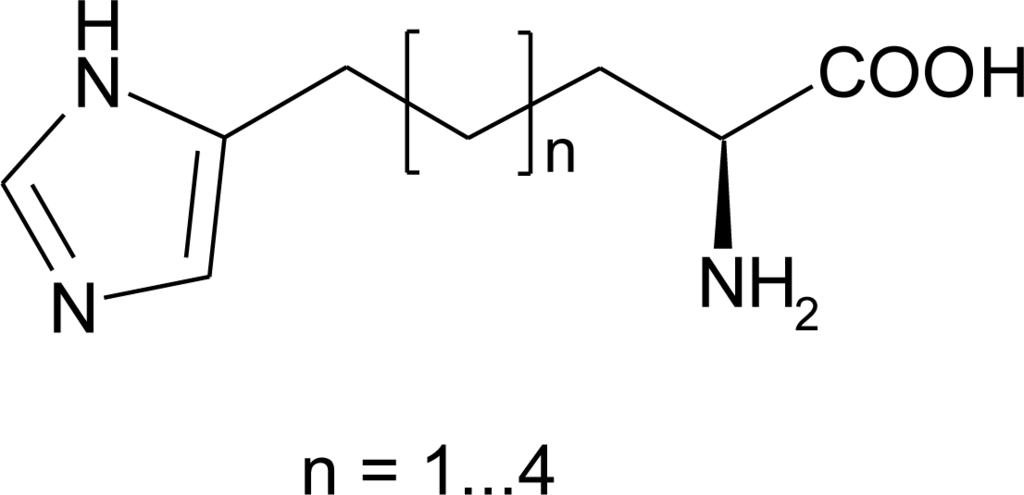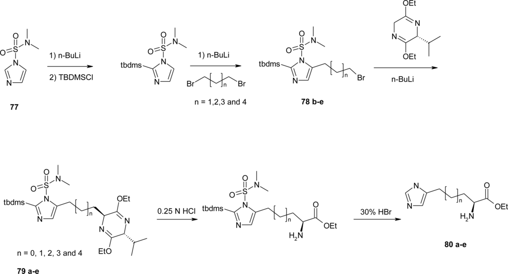 In 1976, De Graw et al. [] prepared a series of substituted histidines and homo-histidines and evaluated the obtained compounds as inhibitors of specific histidine decarboxylase obtained from rat pyloric stomach.