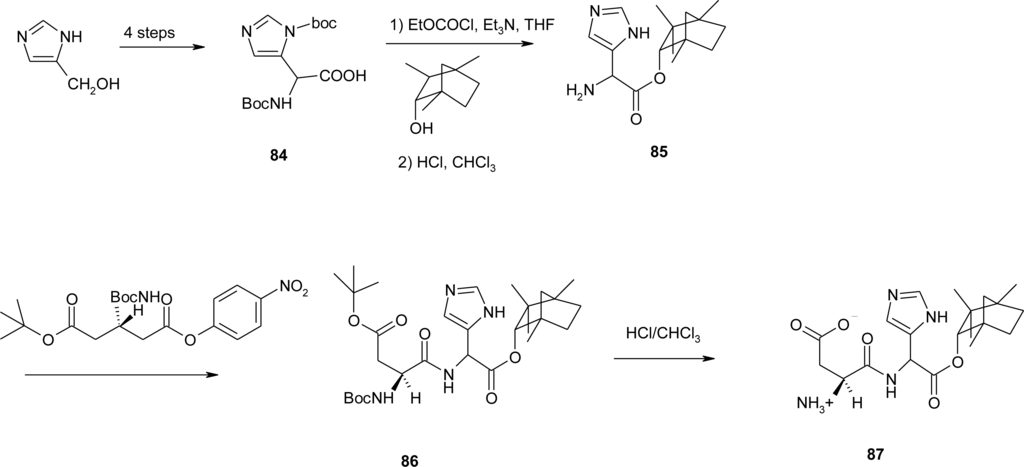In 1989, O’Donnell et al. [] synthesized α-methyl histidine by two complementary routes using a catalytic phase-transfer (PTC) alkylation procedure (Scheme 5).