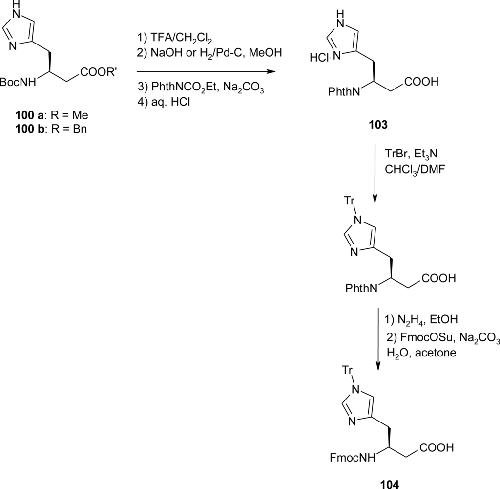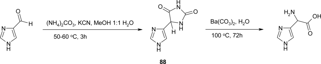 The most important procedure to synthesize cyclic analogues of histidine uses the Pictet-Spengler reaction [,] or modifications thereof, by cyclocondensation of the amino acid His with formaldehyde in the presence of concentrated hydrochloride acid. In general these reactions proceed in good yield (70–97%) and enantiomerically pure amino acids can be obtained from enantiomerically pure precursors. If partial racemization [] occurs fractional crystallization is necessary to obtain the desidered amino acid (yields: 90–99%) [,].