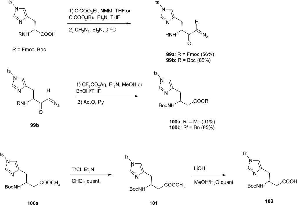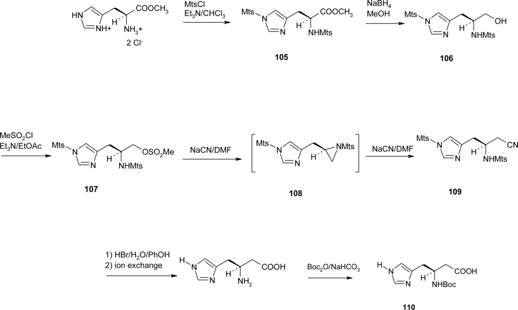 A successful asymmetric synthesis of (2S,3S)-β-methylhistidine 31, by using 2-mesitylenesulfonyl (Mts-) as a protecting group at τ-N in the imidazole ring was reported by Hruby et al. [] (Scheme 7).