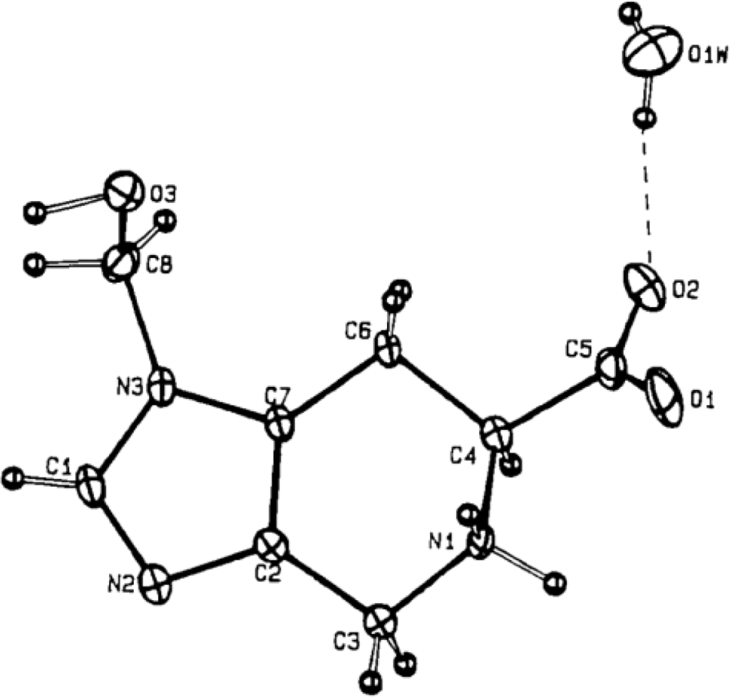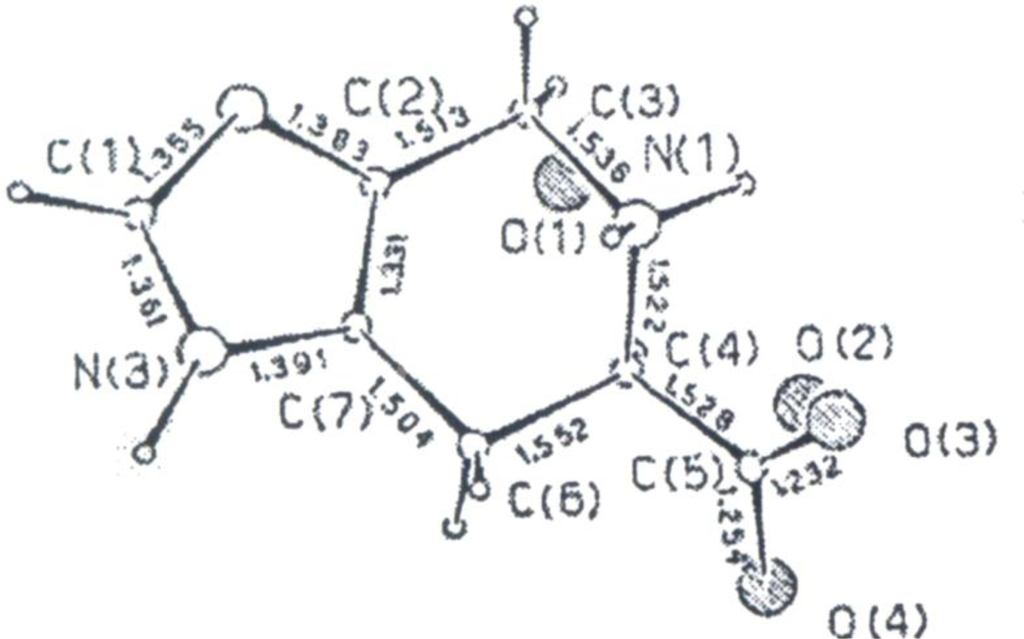 X-ray studies reported by Andreetti et al. [], showed that the crystals correspond to the tautomer having the N(3) atom protonated as shown in Figure 5, in which the bond distances are also reported. Thus, the compound corresponds to the amphionic form of the 4,5,6,7-tetrahydro-1H-imidazo[4,5-c]pyridine-6-carboxylic acid. Condensation of imidazole with tetrahydropyridine removes the π electron delocalisation on the imidazole and produces a double bond localized on C(2)-C(7) [C(2)-C(7) = 1.331(10) Å]. The other bond distances and angles are in agreement with the hybridisation state of the atoms. The imidazole ring and the C(6) and C(3) atoms lie on a plane whereas C(4) and N(1) are out of that plane by 0.208 and −0.568 Å respectively; this as a consequence of the sp3 character of the four atoms of the six-membered ring. The torsional angles around the N(1)-C(3) and C(4)-C(6) are −25.6° and 30.8° respectively. The carboxyl group is equatorial and orientated in such a way that one oxygen points to the NH2+ group to compensate the opposite electrical charge.