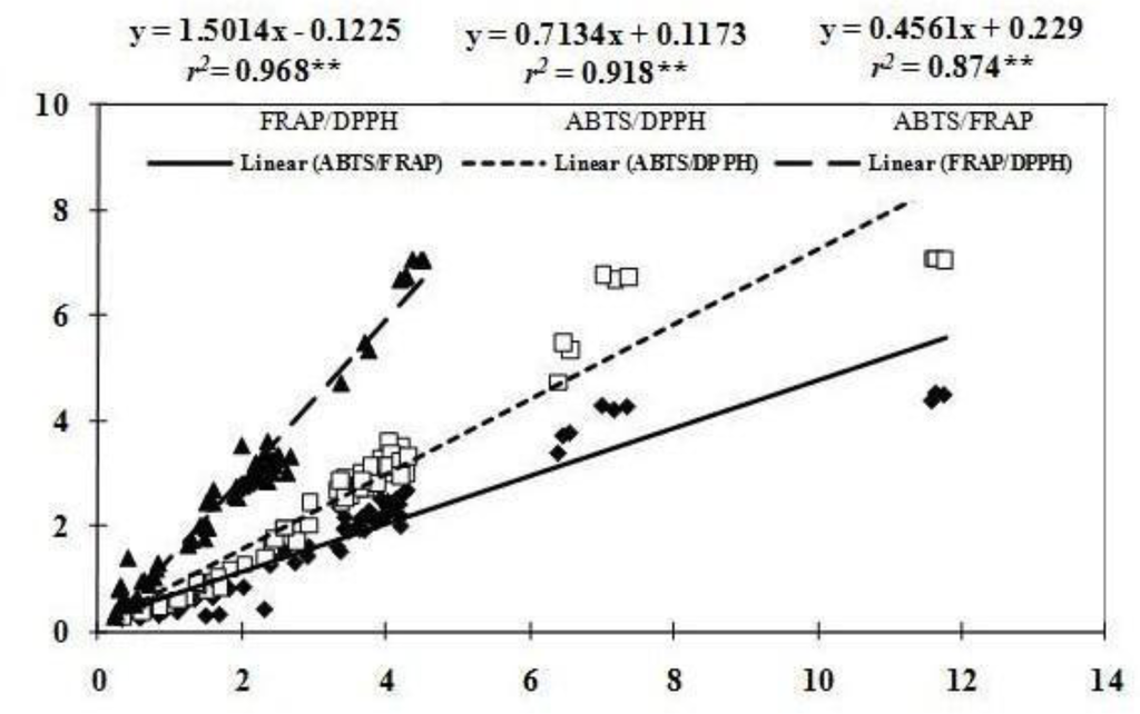 As shown in Figure 2, positive correlation (0.874 ≤ r2 ≤ 0.968) was found among antioxidant capacities determined by FRAP, DPPH and ABTS+ methods. The highest correlation (r2 = 0.968**) existed between antioxidant capacities obtained by FRAP and DPPH assays, while the lowest value (r2 = 0.874**) was found between antioxidant capacities obtained by FRAP and ABTS+ methods. The high relationship between antioxidant capacities measured by these three different methods was also investigated in other crops. Awika et al. [38] observed that antioxidant capacities in sorghums and their products determined by ABTS+ and DPPH assays were highly correlated. In the study of guava, Thaipong et al. [23] also found linear correlations between antioxidant capacities obtained from FRAP, DPPH, ABTS+ and ORAC (oxygen radical absorbance capacity) assays, with the highest correlation between FRAP and ABTS assays, and lowest between DPPH and ORAC assays.