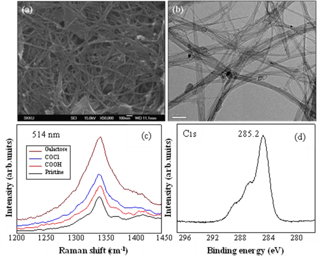 The FE-SEM and HR-TEM observations showed that the structure of the SWCNTs did not change after the reaction with d-(+)-galactose on SWCNTs functionalized with –COCl (Figure 1a and 1b). As shown in Figure 1c, the d-band related to sp3 was markedly increased due to sp3 bonding of d-(+)-galactose immobilized on the surface of the SWCNTs. After the reaction with d-(+)-galactose, the peak of sp3 bonding was increased markedly at 285.2 eV in the XPS C1S analysis (Figure 1d).