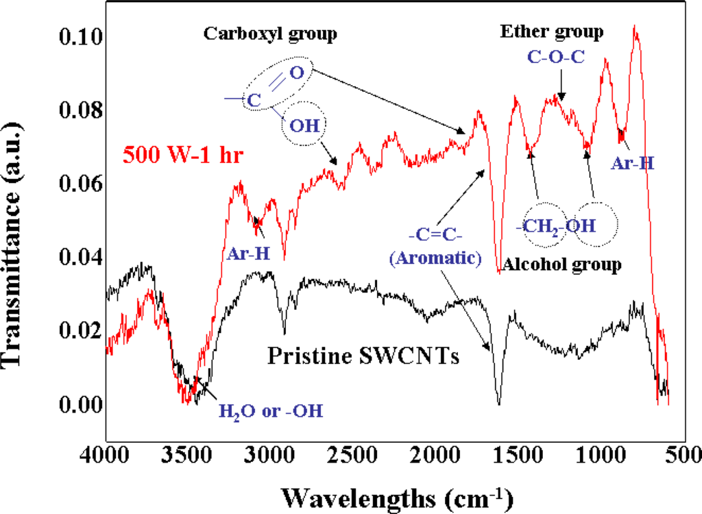 Physical functionalization was performed by treating the surface of SWCNTs with d-(+)-galactose. SWCNTs were mixed with d-(+)-galactose at weight ratios of 1:30, 1:50, and 1:100. In addition, purified SWCNTs were prepared for chemical functionalization on their surfaces. Two different methods, i.e., introduction of –COCl groups at the end of the CNTs and fluorination of CNTs, were used for chemical functionalization of SWCNTs. For introduction of –COCl groups, aliquots of 50 mg of purified SWCNTs were added to 100 mL of 70% HNO3. Then, 250 mg of NaClO3 was added to the resulting reactants under reflux at 100 °C, followed by rinsing with distilled water and alcohol, and poured into 100 mL of DMF solution. After full dispersal, 50 mL of SOCl2 were added to the resulting reactants under reflux at 100 °C. The introduction of –COOH and –COCl groups on the surface of SWCNTs was examined by FE-SEM, FT-Raman and XPS. For fluorination of CNTs, SWCNTs were introduced into the Ni reaction chamber and fluorinated by passage of 0.2 bar of F2 gas into the chamber at 25 °C for 30 min. The fluorination of SWCNTs was also examined by HR-TEM, FE-SEM, and FT-Raman.