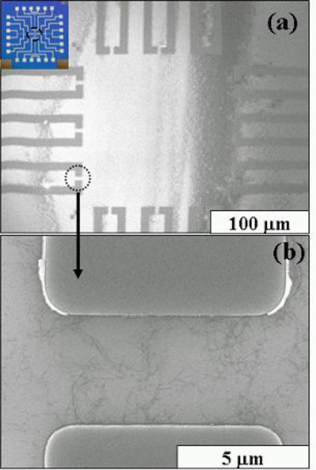 FE-SEM images of the molybdenum electrodes. (a) Twelve pairs of Mo Electrodes (inset: 1 × 1 cm area of the patterned electrode); (b) Dispersed SWCNTs between two Mo electrodes in the region outlined with the black dotted circle in (a). The scale bars in (a) and (b) are 100 μm and 0.5 μm, respectively.