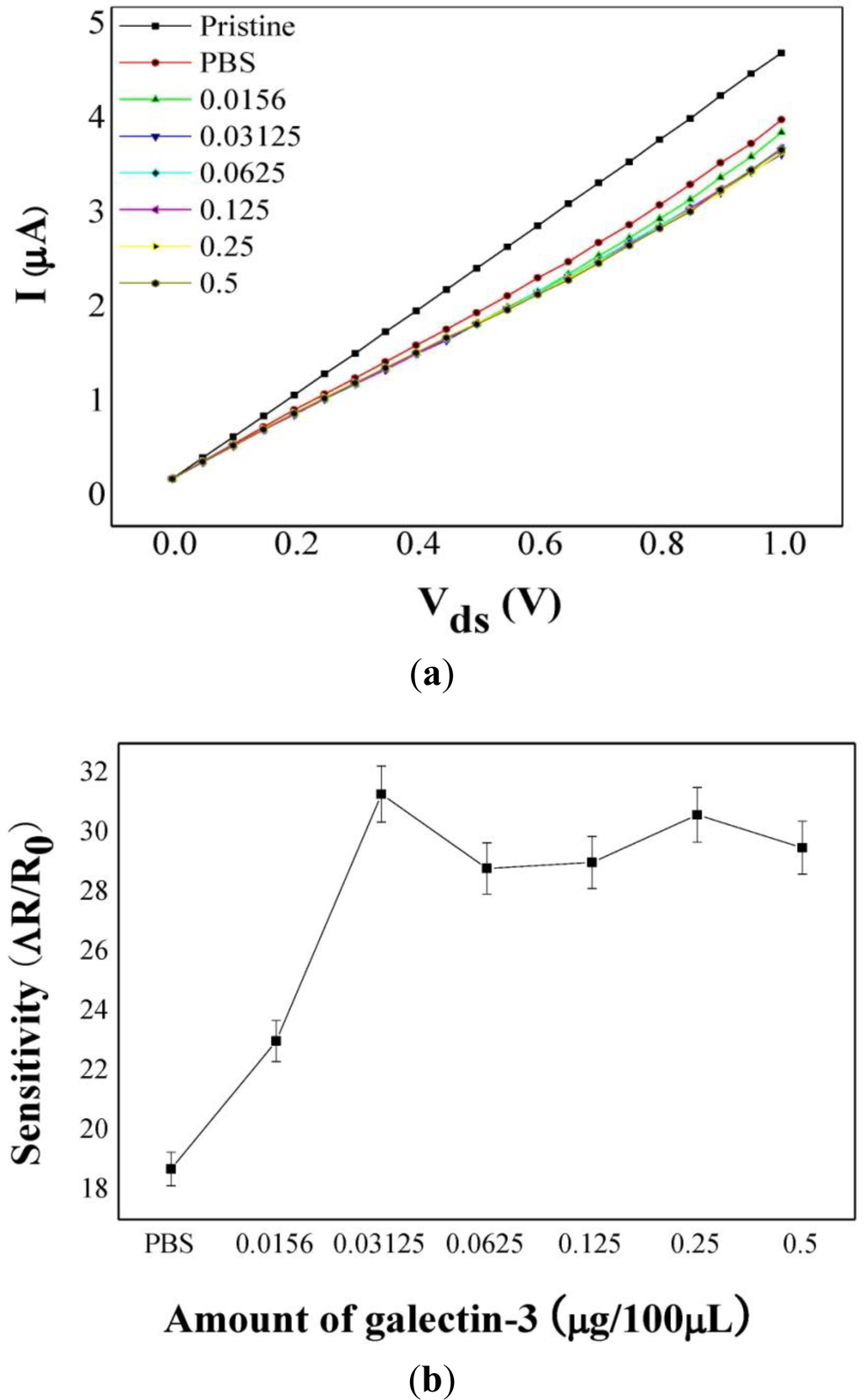 Typical graphical data for (a) I-V measurements and (b) the sensitivities of samples with or without galectin-3. The typical I-V characteristics were measured using the prepared Mo electrodes. SWCNTs dispersed between the Mo electrodes were exposed to various concentrations of galectin-3 in PBS (two-fold serial dilutions from 0.5 to 0.0156 μg/100 μL). The results were obtained from three different experiments. Each bar represents the mean standard deviation.