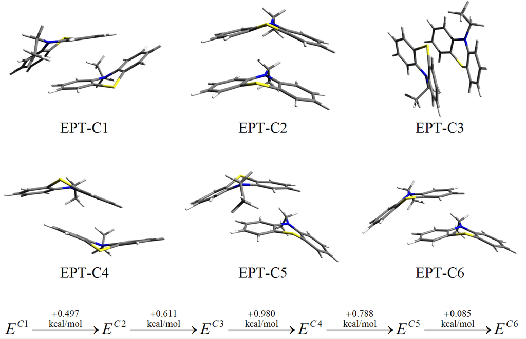 Conformational structures and their relative conformational energies for different ethyl-phenothiazine (EPT) dimers obtained at the DF-LMP2/cc-pVTZ level of theory. (See Reference [11]).