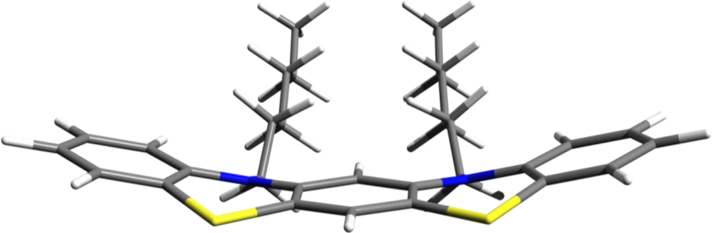 For instance, two rings from two neighboring PTZ molecules could be coupled together in a molecular structure with five rings and two alkyl chains with variable length (See Figure 10). Our guess is that additionally to the enhancement of the π–π stacking interaction the hypothetically designed structure described above will be able to self-assemble in more ordered supramolecular structures.