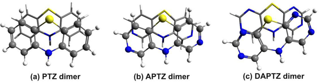 The energy results are collected in Table 1, while the molecular graphics of the APTZ and DAPTZ dimers is presented in Figure 4. Compared the relative position of the monomers, which has a totally symmetric form for the PTZ dimer, in case of nitrogen-substituted systems the monomers are rotated with 8.4° for APTZ and with 16.7° for the DAPTZ dimer.
