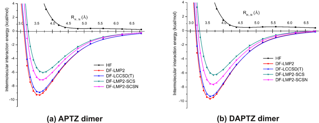 Figure 6 shows a comparison of the potential energy curves for APTZ (a) and DAPTZ (b), obtained at HF and electron correlation levels of theory, using the cc-pVDZ basis set. The energy minimum and the corresponding equilibrium distance for each curve presented in Figure 6 are given in Table 2.