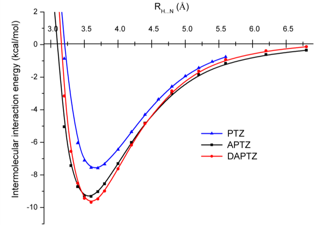 A similar conclusion was obtained also in the case of phenothiazine dimers [11]. In order to be able to discern the effect of the substituted nitrogen atoms in the phenothiazine we have put together (See Figure 7.) the three potential energy curves obtained at DF-SCSN-LMP2 level of theory, applying the cc-pVDZ basis set. As we can see, the black and red curves specific for APTZ and DAPTZ pairs show dimers that are stronger with ≈2.0 kcal/mol than the PTZ dimer (blue curve).