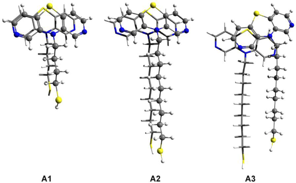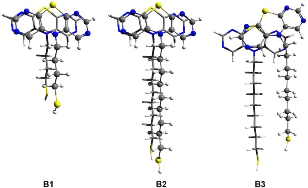 The values are: 1.49 kcal/mol and 1.84 kcal/mol, respectively. As we can see, there is a significant amount of deformation energy which can weaken the intermolecular interaction and accordingly decrease the conformational energy difference between the ordered and the “defected” structures. Similar molecular geometries were built in the case of DAPTZ-type head-group. The molecular structures with optimized geometry are shown in Figure 9. Similar ordered and defected configurations were obtained for thiol-butyl-DAPTZ (B1) and thiol-nonyl-DAPTZ (B2 and B3). The intermolecular energies of the ordered structures are: −12.78 kcal/mol for the thiol-butyl-APTZ and −16.11 kcal/mol thiol-nonyl-APTZ, respectively. The interaction energy for the thiol-butyl-APTZ “defected” geometry is −18.87 kcal/mol. On the same grounds, the configuration energy difference between the ordered (B2) and the “defected” (B3) configurations is 1.29 kcal/mol, while the monomers deformation energy (B3) is 1.79 kcal/mol.