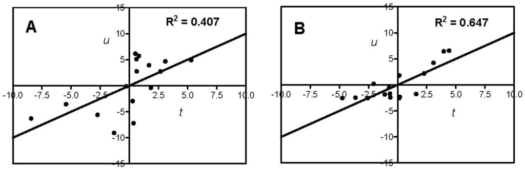 PLS modeling of amino acid parameters (X) and four different antioxidant activities (Y) of the food protein hydrolysates and fractions resulted in 12 models as shown in Table 1. The ferric reducing antioxidant property (FRAP) model (AA only) gave the best fit and predictive power whereas models for H2O2-scavenging displayed the lowest predictive powers (Figure 1 and Table 1). The R2 values (Table 1) indicated that the PLS models explained 30% to 73% of the sum of squares in Y-variance for all the oxidative systems with up to 66% predictive ability (derived from Q2cv). The 12 models were theoretically validated initially by cross-validation during modeling and their predictive power also validated by permutation, where the bioactivity data were each randomly permuted a number of times but with unaltered X-variable followed by modeling of each permutation [13]. As shown in Table 1, repeated (20) rounds of permutation yielded cumulative R2 (R2cum) intercept values of 0.006 to 0.314 and Q2cv intercept values of −0.223 to −0.008 for the 12 models, which are within suggested valid limits of R2cum intercept <0.4 and Q2cv intercept <0.05 for valid PLS models [25]. The t/u PLS score plots show relationships between X and Y variables in the AA + gAA + Σzi (antioxidant activity + amino acid group + sum of z values) models for the four oxidative systems (Figure 1A–D). With the exception of the weak fit for H2O2, the data showed good fit and must have contributed positively to obtaining valid models that we used to determine relationships between amino acids or groups of amino acids and contributions to antioxidant potential of the food protein hydrolysates.
