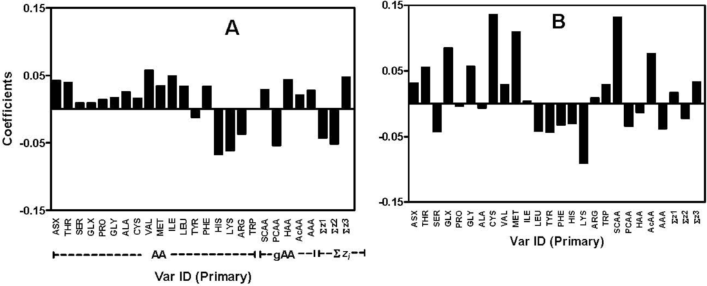 The importance or relative contribution of the amino acid descriptor variables (X) in PLS modeling was obtained from the VIP plots (Figure 2A–D). The X variables with VIP > 1.0 are regarded as important with above average contribution while those with VIP < 0.5 are unimportant; variables with 1.0 > VIP > 0.5 could be important or not depending on the size of the dataset [26]. For example, the sulphur-containing (SC) amino acids as a group as well the individual amino acids that include Met, Cys, Leu, and Lys are strong contributors (VIP values > 1.0) to the superoxide model (Figure 2D). In contrast, Gly, Ala, His, Asx, and Ile are poor contributors to the superoxide model due to VIP values of <0.5. For our present study, X-variables were regarded as important strong contributors only when their VIP > 1.0 and weak contributors with VIP of 0.5–1.0. The relative contribution of X-variables in the PLS models depends on the value of the coefficients relative to the origin in the loading space [13]; in other words, the higher the coefficients in both directions, the more the contribution of the X-variable in explaining or predicting Y [27]. The coefficients (Figure 3A–D) and VIP plots (Figure 2A–D) indicated that the specific contribution of each or groups of amino acid and physicochemical properties (3-z scales) depends on the oxidative assay system. As shown in Figure 3A and Table 2, a high percentage composition of Thr, Asx, hydrophobic amino acids, as well as ↑Σz3 (high electronic properties), ↓Σz1 (low hydrophilicity or high hydrophobicity) and ↓Σz2 (low bulk/molecular size) of the samples contributed positively to 2,2-diphenyl-1-picrylhydrazyl (DPPH)-scavenging. Interestingly, PCAA including His (highest VIP value) contributed negatively to the scavenging of DPPH. A similar pattern was also observed for H2O2-scavenging in addition to the strong positive contributions of Cys, Phe, Leu and Pro in this oxidative system (Figure 3C). Moreover, the SCAA (Cys + Met) were observed to be the strongest contributing amino acids for ferric reducing antioxidant power of the peptide mixtures whereas high amounts of Lys strongly reduced this activity (Figure 3B). In contrast, Lys and Leu composition supported superoxide radical scavenging by the samples while SCAA Met and Cys (highest VIP values) strongly reduced this activity. Interestingly, low z1 (high hydrophobicity) character seem to have strong positive contributions to scavenging of the free radicals like DPPH and superoxide anion radical (O2−) as well as H2O2 (a reactive oxygen species) but not FRAP. The results agree with previous reports that indicate hydrophobic amino acids are able to interact better (when compared to hydrophilic amino acids) with the lipophilic environments that contain these free radicals. Table 2 also shows other amino acid compositions and properties that weakly contributed positively or negatively to the antioxidant activities of the peptide samples in the four oxidative systems.