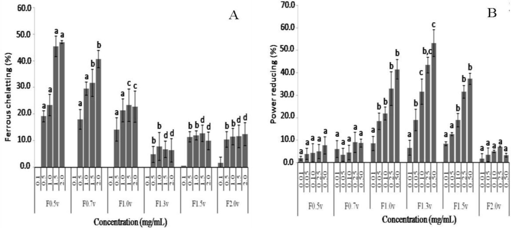 Antioxidant activity of sulfated polysaccharides from Dictyopteris delicatula. (A) Chelating effect; (B) Power reducing assay. Each value is the mean ± SD of three determinations. a,b,c,d Distinct letters indicates a significant difference between sulfated polysaccharides when compared at each concentration (p < 0.05).