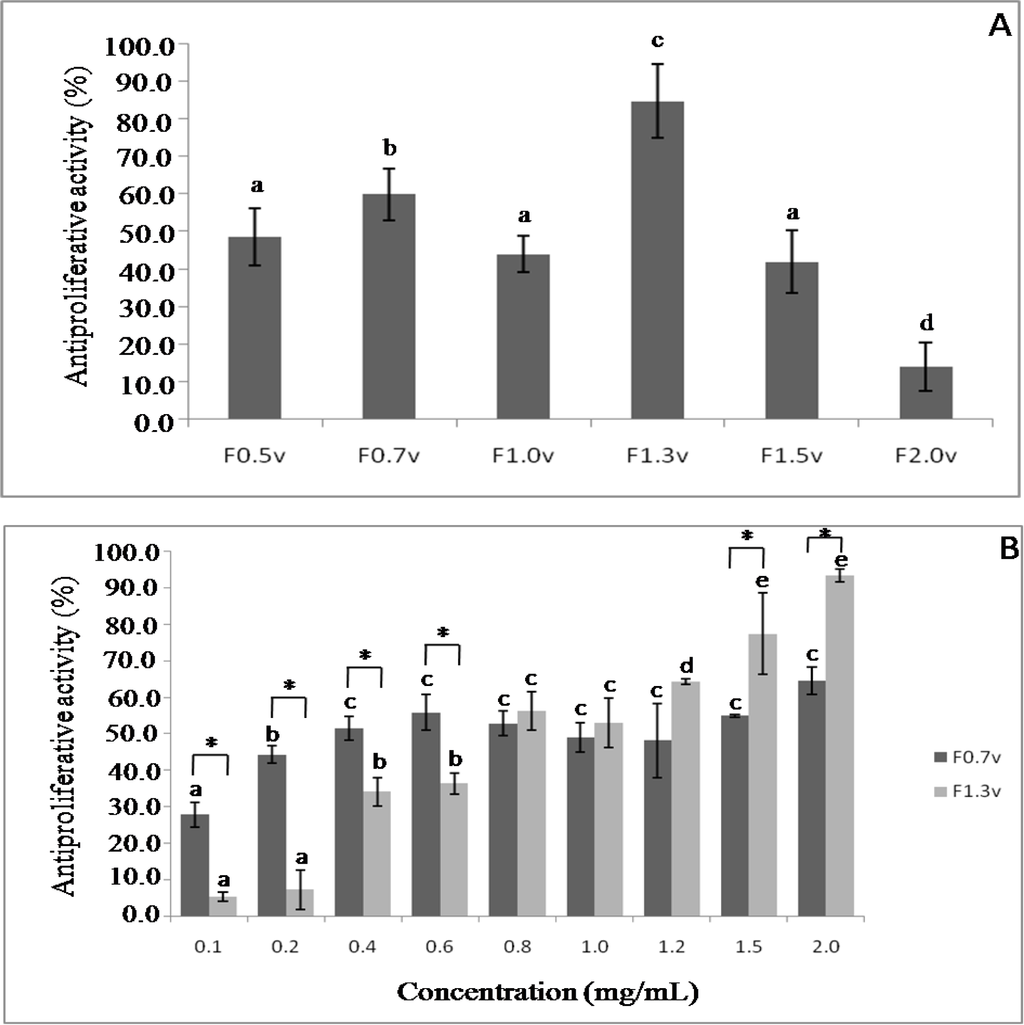 Influence of sulfated polysaccharides from Dictyopteris delicatula on inhibition of cell proliferation of HeLa cells after 72 h incubation: (A) Antiproliferative activity of sulfated polysaccharides at concentration of 2.0 mg/mL; (B) Dose-dependent effect of sulfated polysaccharides. Each value is the mean ± SD of seven determinations. Different letters indicates a significant difference between concentrations of individual sulfated polysaccharides (p < 0.05); the asterisk indicates a significant difference between different sulfated polysaccharides at same concentration (p < 0.05).