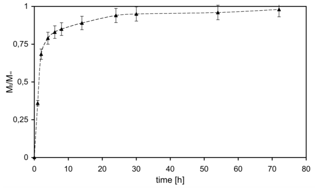 At first, hydrogel ability to release drugs in accordance with medical needs was investigated and the results are presented in Figure 1, as cumulative mass fraction released in the outer solution (Mt/M∞).