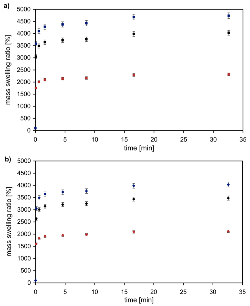 Swelling kinetics of AC1 (a) and AC1_SF loaded hydrogel (b) in different pH solvent values (pH = 0.5 (red); pH = 7.4 (black); and pH = 14 (blue)).
