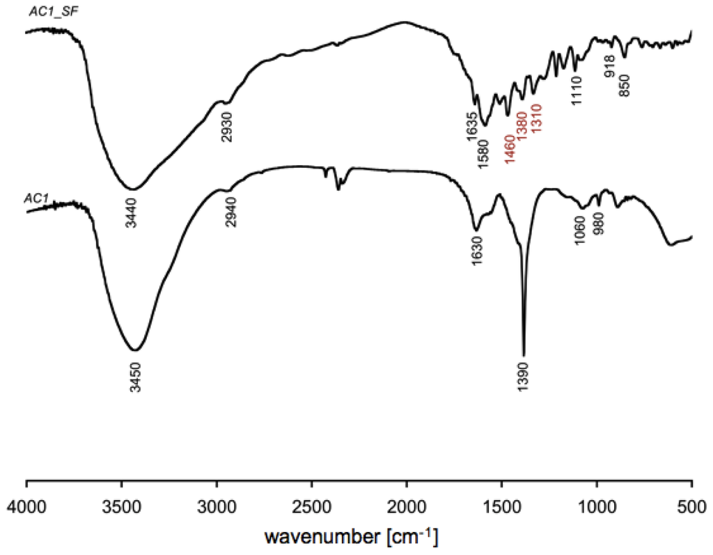 Fourier transform infrared (FT-IR) spectra for both AC1 and AC1_SF gel samples. In red are highlighted peaks showing the presence of SF within the three-dimensional polymeric network.