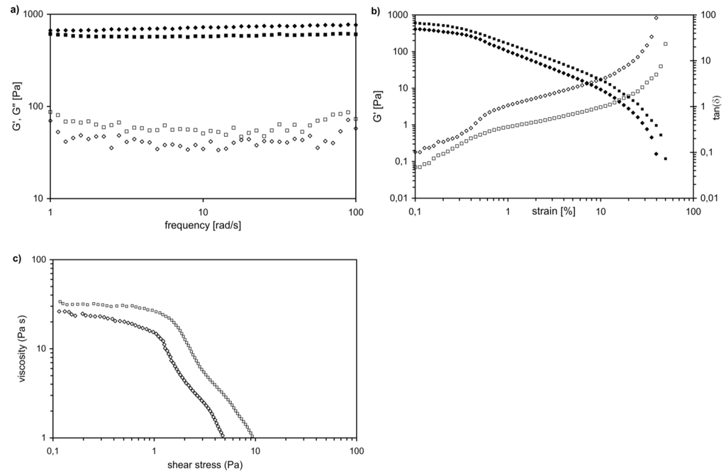 (a) Mechanical spectra of AC1 and AC1_SF gels at room temperature with small oscillatory shear in the linear viscoelastic regime: G′ (■ AC1, ♦AC1_SF ) and G″ (□ AC1, ⋄ AC1_SF ) are frequency independent, indicating dominant viscoelastic relaxations at lower frequencies; (b) Dynamic strain sweep experiments of AC1 (G′ (■) and tan(δ) (□)) and AC1_SF (G′ (♦) and tan(δ) (⋄)) at constant frequency; (c) Measure of yield stress of AC1 (■) and AC1_SF (♦) by oscillatory experiments.