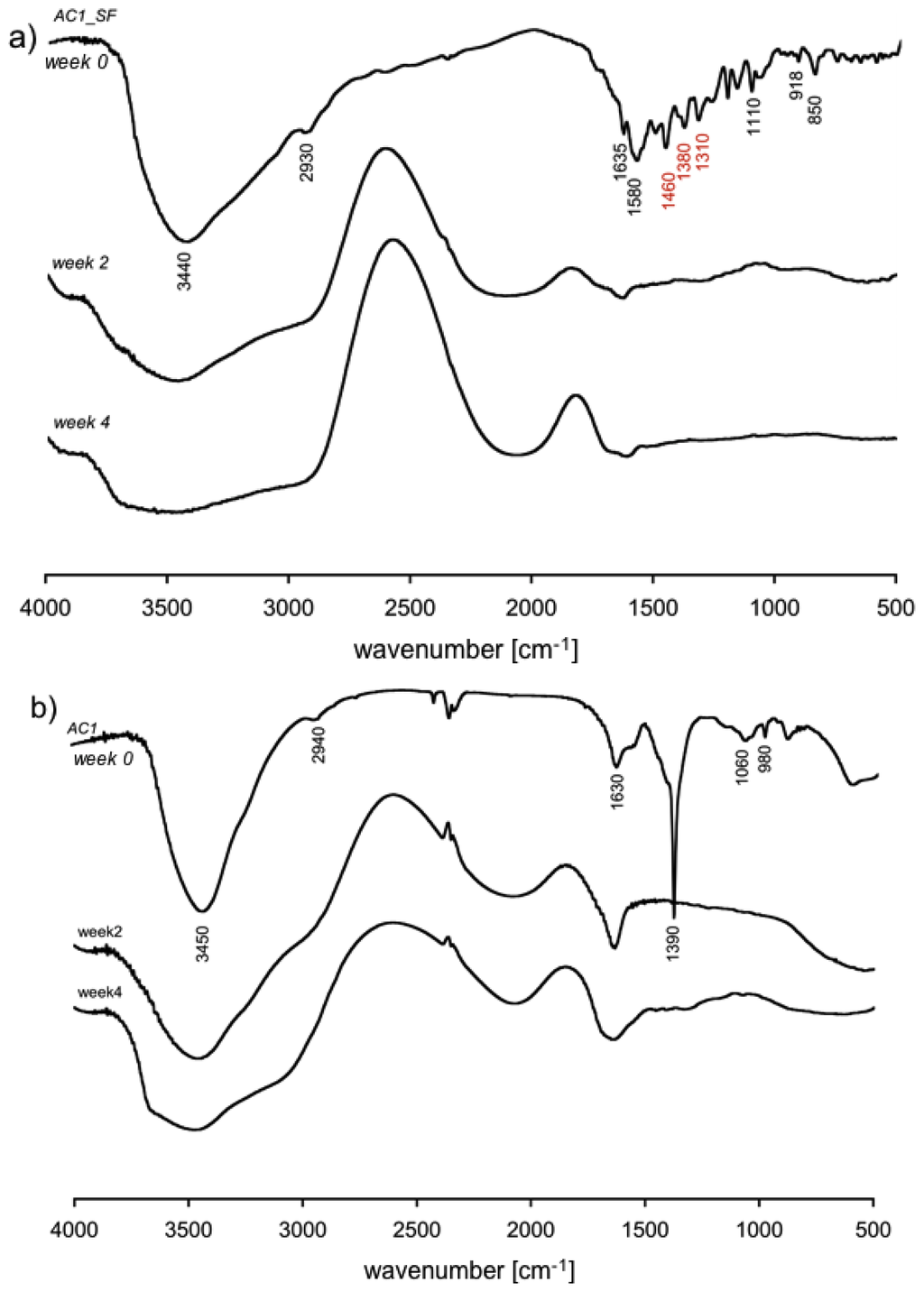 (a) FT-IR spectra of AC1_SF before and after 2 and 4 weeks of degradation in PBS; (b) FT-IR spectra of AC1 before and after 2 and 4 weeks of degradation in PBS.