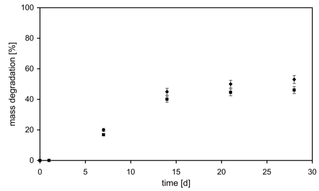 Degradations were performed in PBS at 37 °C under agitation. The buffer was changed daily, and at 1, 4, 7, 14 and 28 day of incubation the buffer was removed, the polymer samples were lyophilized and degradation was quantified using the following equation []: