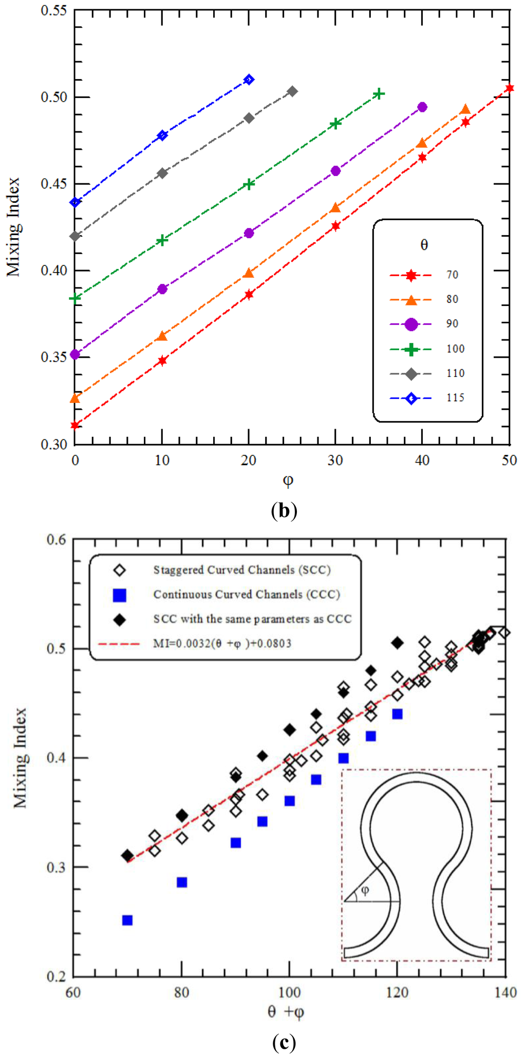 where a is around 0.003166, and b is around 0.08226. It can be found that the maximal mixing index is related with the maximal value of the sum of θ and ϕ. The effect of ϕ on the mixing index of continuous curved channels with the same path length per segment as the SCC is also shown in Figure 11c. The intersection of two consecutive curves of continuous curved channels is located at a point, and θ does not exist. We take θ equal to 70° as a base reference. Results show that the mixing index of continuous curved channels (marked by blue square points in Figure 11c) increases with the increasing of ϕ and is less than that of staggered curved channels with the same values of the sum of θ and ϕ (marked by black diamond points in Figure 11c).