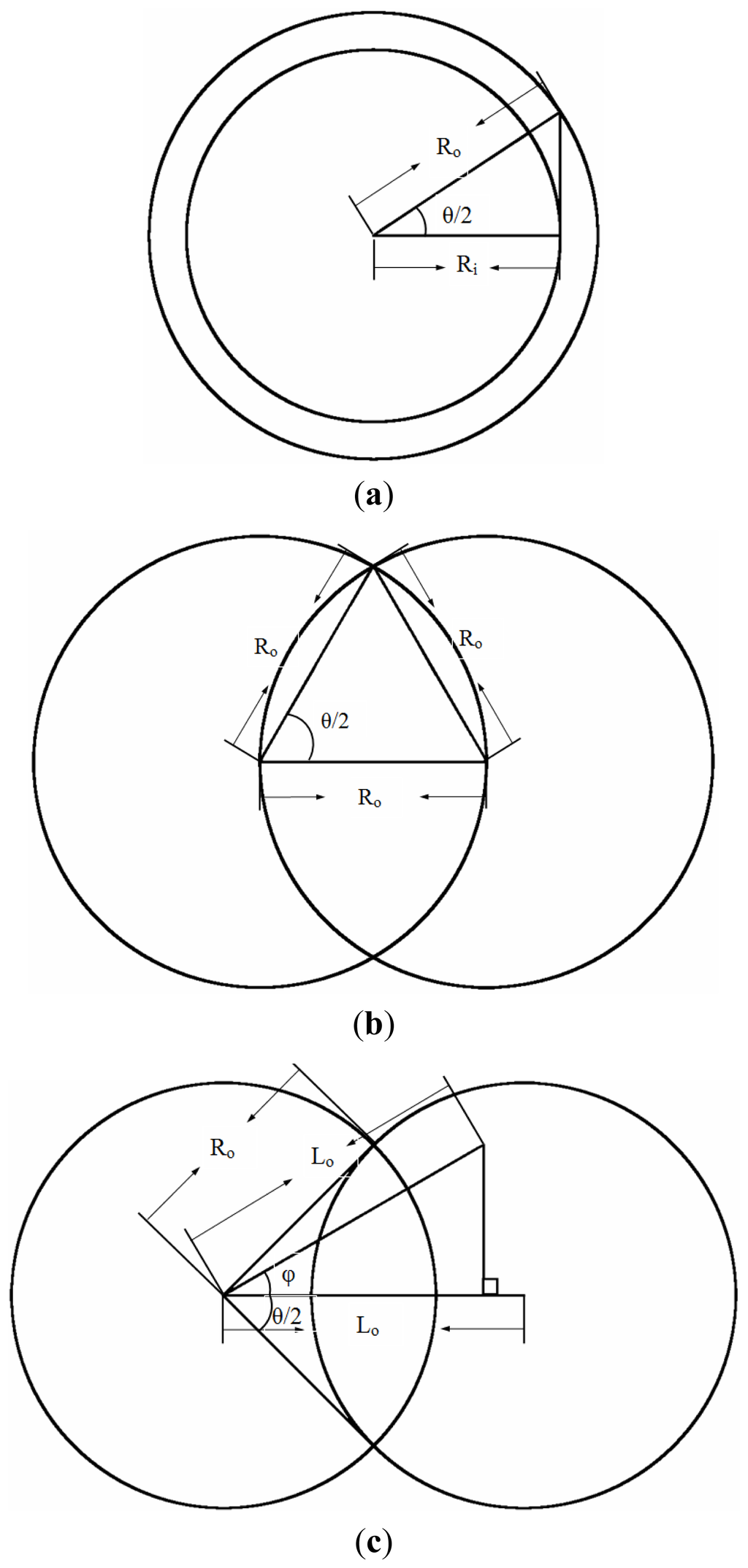 The maximum length between the centers of consecutive circles, Lo, is shown in Figure 12c. The relationship between Lo and Ro is expressed as