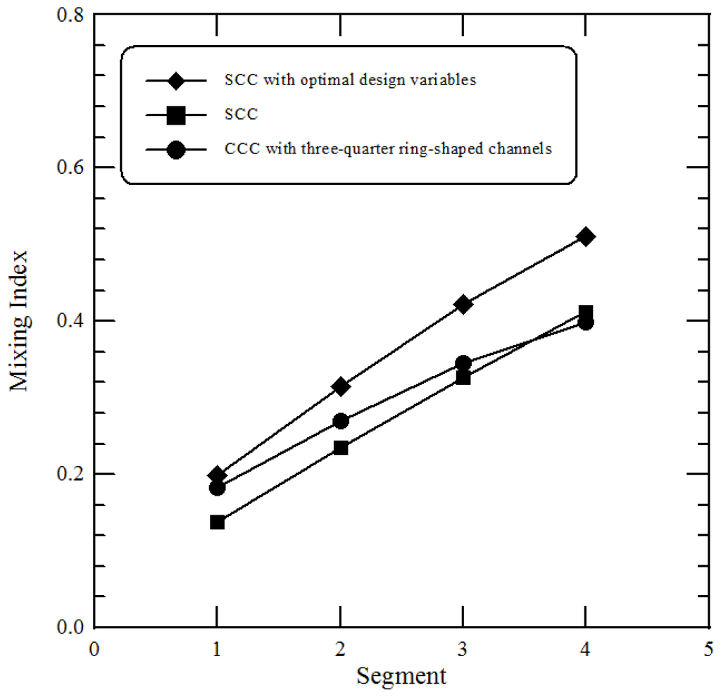 In addition to mixing index, the pressure drop is also an important issue in the design of micromixers. The pressure drops in the microchannels with four segments are 5913.27 Pa, 2754.33 Pa, 3958.09 Pa and 3956.35 Pa for the CCC with three-quarter ring-shaped channels, the SCC, the CCC with semi-circular channels and the channel with a straight section, respectively. The SCC has the lowest pressure drop among these channels. Each segment of our micromixer is comprised of 3 curved channels with uniform width. The flow rate in each sub-channel is reduced compared to the main channel. Despite the existence of the additional bends and the presence of the Dean vortices, the pressure drop of the SCC is less compared to the channel with a straight section. Besides, the SCC has a higher mixing index than the straight microchannel from Figure 5b.