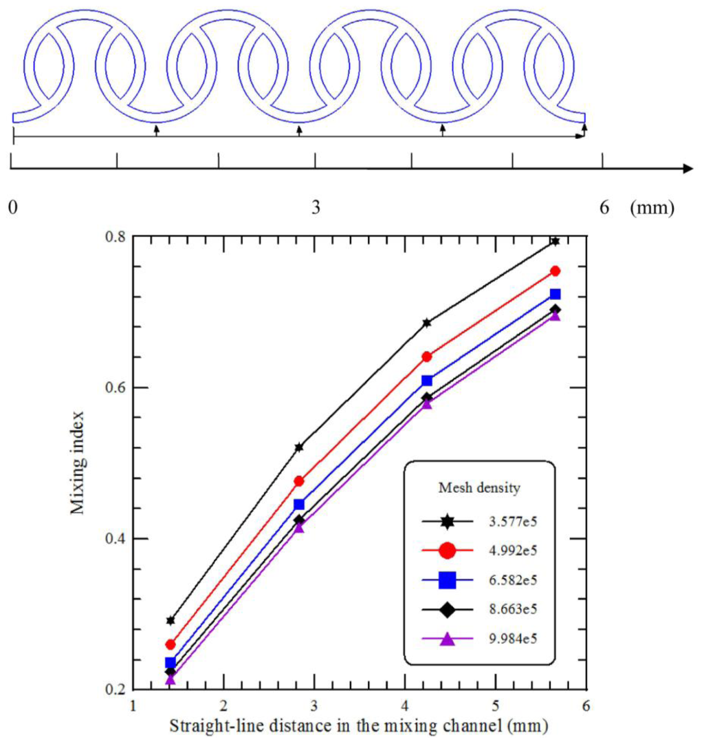 The numerical simulation is not free from numerical diffusion errors. In Eulerian simulations, the continuous differential equations of motion are deconstructed into discrete algebraic equations. These discrete equations are generally more diffusive than the original differential equations. If liquid fluids flow diagonally through the simulated grid, then the numerical effect takes the form of an extra high diffusion rate. In the proposed grid systems, meshing is generally aligned in the flow direction in the computational domain, shown in Figure 1b. In order to obtain mesh-independent results from the simulations, a preliminary mesh size sensitivity analysis is carried out. Mesh density is increased continuously until it has minimal effects on the mixing index at the specific cross sections. Figure 2 shows the values of the mixing index at different cross-sectional planes in the four-segment mixing channel at an inlet flow velocity of 0.25 m/s, which corresponds to the Re of 25. The analyses of five mesh densities ranging from 3.577 × 105 to 9.984 × 105 are used and the two finest meshes give a negligible relative difference in their corresponding values that indicates they are mesh-independent. The values of maximum velocity inside the microchannel and the mixing index at the outlet section for the five mesh densities are also shown in Table 1. Finally, the mesh density with 8.663 × 105 has been chosen for further investigation since the mixing indices at the specific location are almost the same and the numerical results are grid-independent. Also, the four-segment mixing channel is used unless noted otherwise.