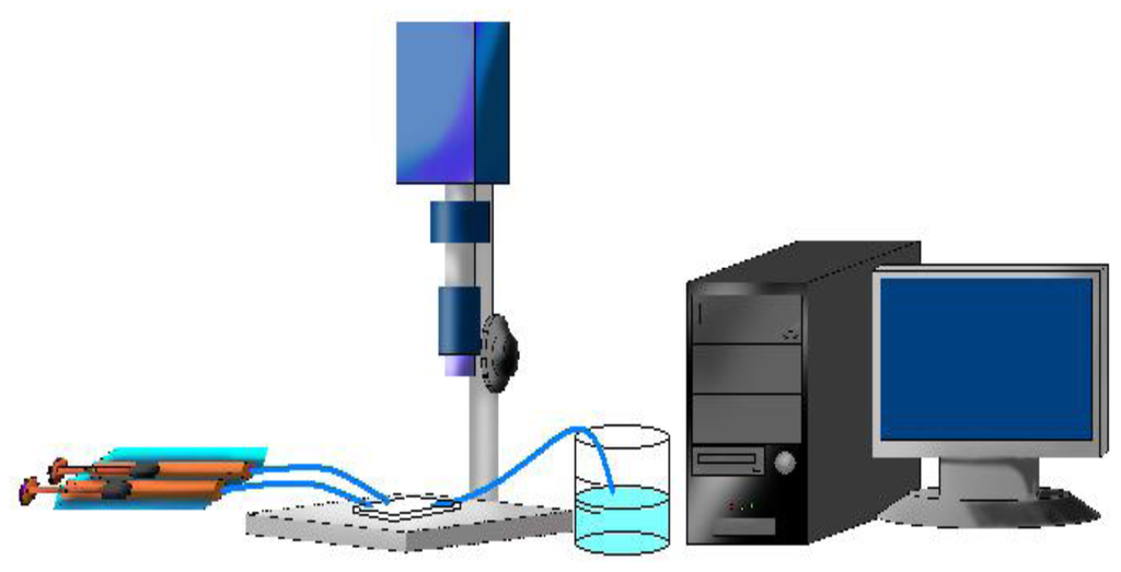 Two different fluids are injected into the microchannels using a programmable syringe pump (KDS-101, kdScientific Inc., USA). Figure 3 shows the schematic of the experimental setup used to obtain mixing performances. The flow rates range from 0.003 mL/min to 0.3 mL/min corresponding to the Re from 0.5 to 50. The experimental setup for testing the performance of the fabricated micromixers is described as follows. Two syringes are loaded with 0.31 mol/L phenolphthalein and 0.33 mol/L NaOH dissolved in 99% ethanol. The NaOH solution possesses a pH value of about 13. Phenolphthalein solution, as a pH indicator, has a characteristic of changing color from transparent to purple at pH values greater than 8. As a result of the rapid reaction between phenolphthalein and NaOH, the interface between the two streams turns purple within a negligible time [17]. The working fluids first enter the inlet channels, flow through the micromixer, and finally exit through an outlet channel. Once a steady state is attained, an optical microscope (Eclipse 50i, Nikon, Japan) and CCD camera (DC80, Sony, Japan) are set up to observe the color changes inside the channel. Images are captured at each segment along the downstream direction. The captured digital images are converted into grayscale images that give the luminance of the image in 256 levels, and analyzed using software (MATLAB, The MathWorks, Inc., USA).