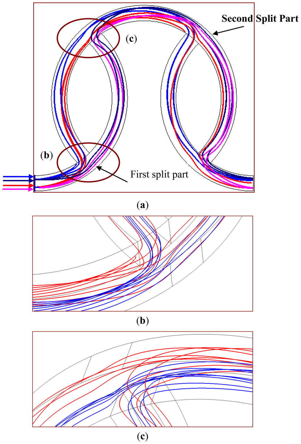 Particle trajectories of the staggered Dean Vortex micromixer from (a) a front view; (b) a vertical view near the split part and (c) a vertical view near the recombined part.