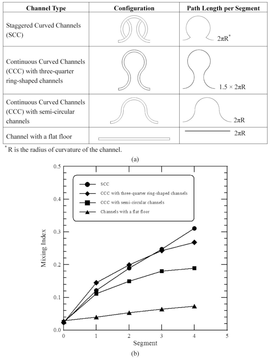 To evaluate the mixing performances of staggered curved microchannels, the results are compared with the previous work [12]. In every mixing segment of their design, the microstructure consisted of one three-quarter ring-shaped channel and two three-eighth ring-shaped channels (i.e., Continuous Curved Channels (CCC) with three-quarter ring-shaped channels). Each segment of our design is comprised of 3 staggered curved channels which are three-eighth ring-shaped and three-quarter ring-shaped (i.e., Staggered Curved Channels (SCC)). Our micromixer has the same separate microstructures as the previous design; however, the path length per segment is different, as shown in Figure 6a. In order to evaluate the mixing performances between the staggered curved microchannels and the continuous curved microchannels, a microstructure which is composed of one semi-circular channel and two three-quarter ring-shaped channels is also introduced (i.e., Continuous Curved Channels (CCC) with semi-circular channels). The path length per segment of the former structure is the same as that of our designed micromixer. This work also examines a microchannel with a straight section. The geometric design of the proposed CCC is modified and scaled to be a similar size to that of our mixer.