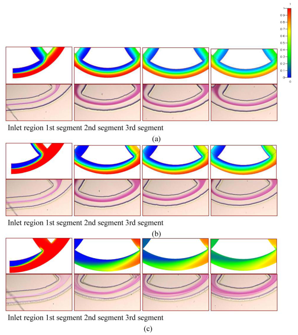 At Re = 1 in Figure 8a, the flows follow the contours of the curved channel. As the flow proceeds forward, a little more solution moves toward the inner part of the channel. The mixing of two fluids is only through molecular diffusion across the interface of the two liquids. However, Dean vortex flows can be created at Re greater than 10, as shown in Figure 8b. The interface surface deforms along the downstream. It shows that a more reacted solution stream passes through the inner half of the channel and the variation of the concentration distribution along the radial direction can be seen clearly. At a Re = 50 in Figure 8c, two fluids are folded into each other and split into multiple streams due to the large vortex flow combined with the SAR effect and the impact effect. Notably, because of the increases of the interfaces of the two fluids, reacted phenolphthalein streams are increased and mixing is improved. The results of the numerical simulations show that an enlarged interfacial surface area is increased considerably, especially for the case where Re is equal to 50. Due to numerical diffusion, simulations show better mixing than experiments. However, the comparison between the experimental data and numerical results shows a very reasonable agreement.