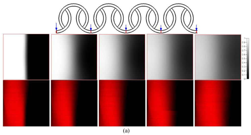 Figure 9 shows cross-sectional mixing behaviors in the staggered Dean Vortex micromixers at five locations observed by means of a confocal microscope. The mixing results are taken at five representative positions, such as the inlet, the first, the second, the third and the fourth segments beyond the inlet in the downstream direction, marked by red lines. Around the inlet region of the SCC, only the half-zone containing Rhodamine shows a bright image as a result of laser scanning. The interface between streams is distorted as it moves downstream. The fluid near the centre experiences a larger centrifugal force than that near the top and the bottom. Consequently the liquid flowing along the central axis is forced outward (from left to right), and the liquids near the top and the bottom flow inward (from right to left). Thus the stretching of the interface can be presented and enhance mixing. We found that fluids are mixed well and the interface is distorted at a high Re. As demonstrated by the confocal microscope images in Figure 9, the staggered Dean Vortex micromixer can be regarded as a well-designed passive micromixer to achieve almost complete mixing in a manageable length of channel. The results are also compared with the numerical results and a similar trend can be shown.