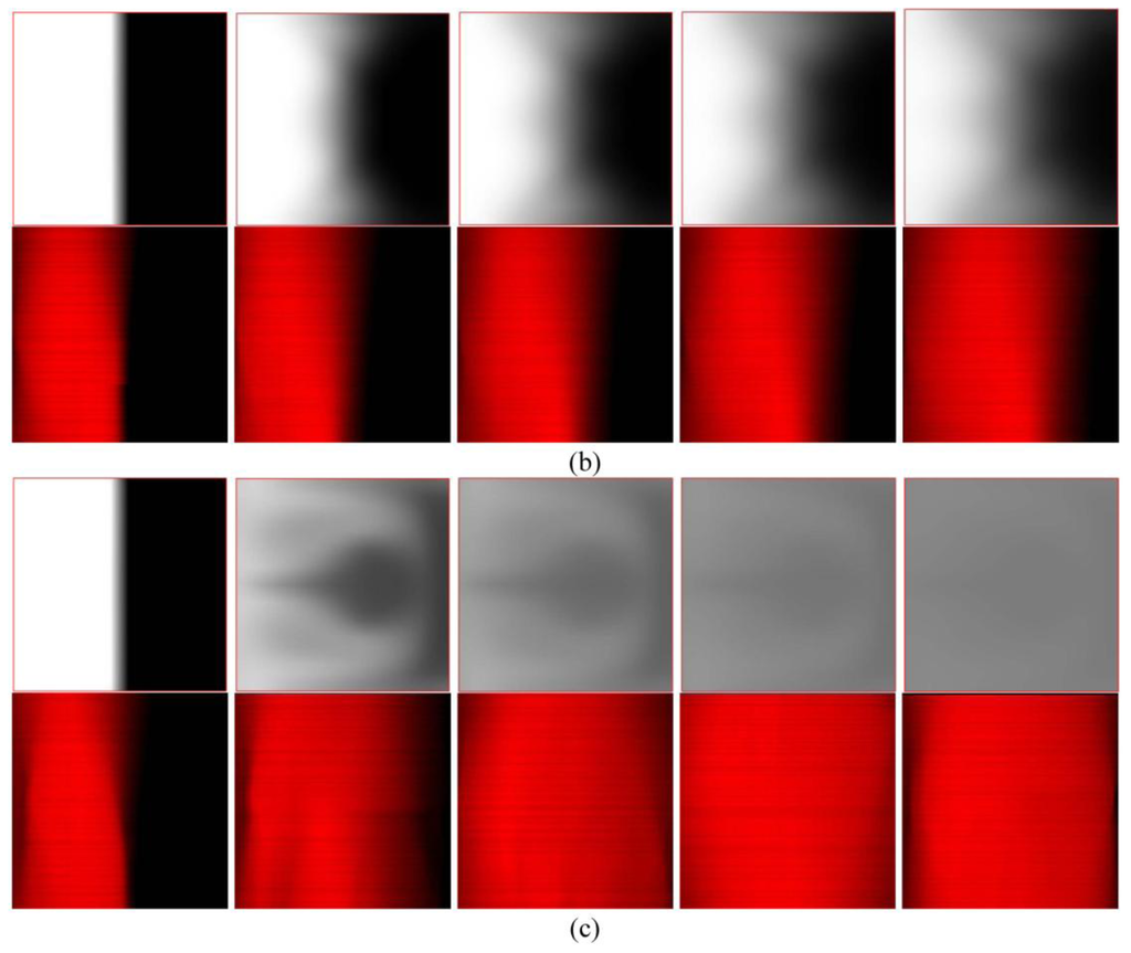Numerical results (top) and reacted phenolphthalein images (bottom) for (a) Re = 1, (b) Re = 10 and (c) Re = 50 in different regions. The flow is from left to right.