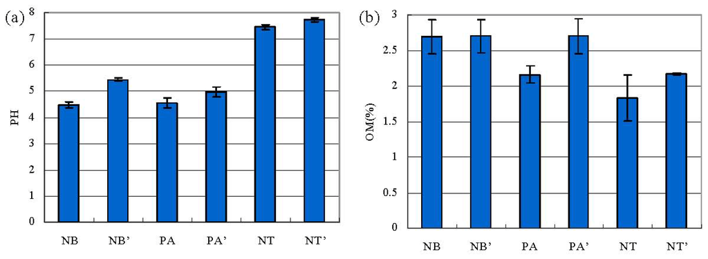 In comparison with the bulk soil, pH is lower in the rhizosphere in each region. The OM content of the bulk soil varied between 2.13% and 2.49%, higher than in the rhizosphere where OM contents ranged from 1.85% to 2.46%. Furthermore, lower activities of both enzymes were observed in the rhizosphere, which is contrary to results in many researches [], which reported the enzyme activities were higher in rhizosphere than in the bulk soil of Cunninghamia lanceolata, Pinus sylvestris var. mongolica and Camellia oleifera.