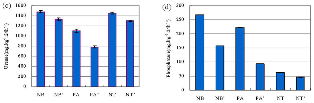 The pH, the content of organic matter and the activities of urease and phosphatase in soil samples of F. thunbergii: (a) pH; (b) organic matter content; (c) urease; (d) phosphatase. For convenience, the soil samples were named by the abbreviation of the producing area, including PA (the rhizosphere soil in Panan); PA′ (the bulk soil in Panan); NB (the rhizosphere soil in Ningbo), NB′ (the bulk soil in Ningbo); NT (the rhizosphere soil in Nantong) and NT′ (the bulk soil in Nantong).