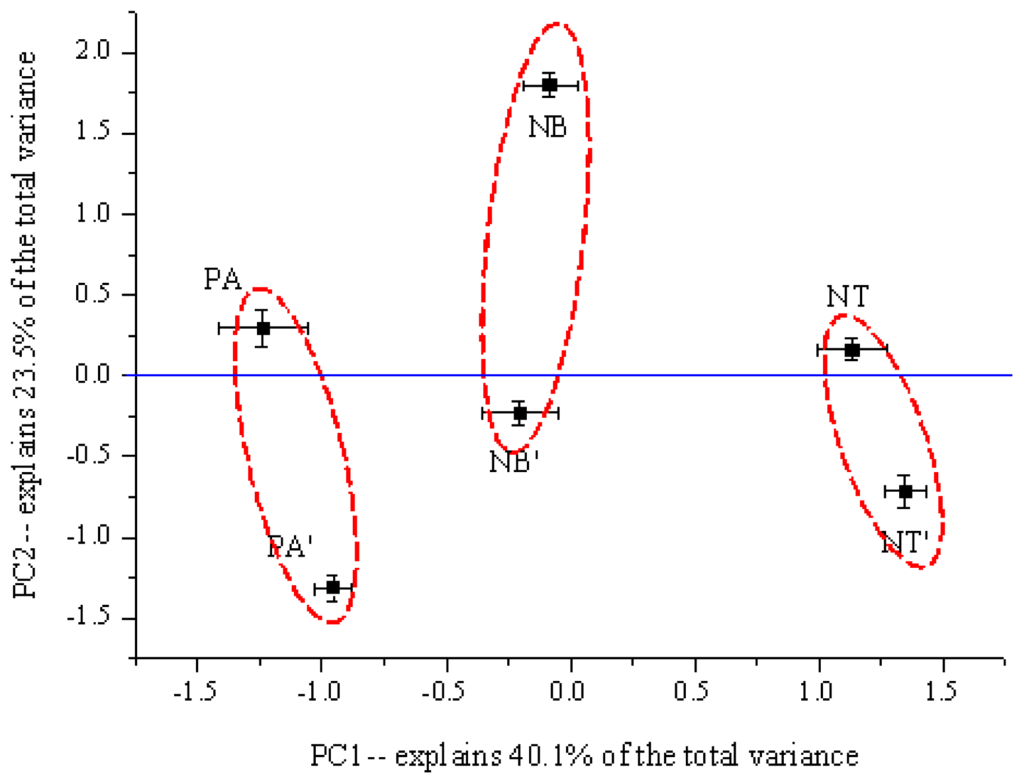 Principal component analysis (PCA) of all soil samples of F. thunbergii. X axis was defined by PC1 which represented 40.1% of the total variance and Y axis was defined by PC2 which represented 23.5% of the total variance. Abbreviations: NT: The rhizosphere soil in Nantong; NT′: The bulk soil in Nantong; PA: The rhizosphere soil in Panan; PA′: The bulk soil in Panan; NB: The rhizosphere soil in Ningbo, NB′: The bulk soil in Ningbo.