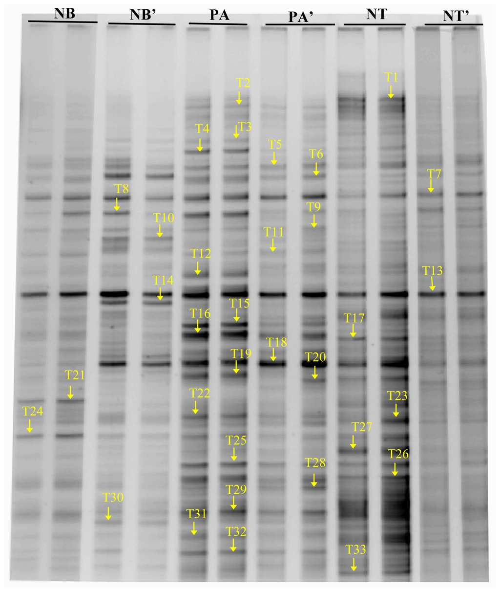 PCR-DGGE profiles of soil bacteria in different producing areas. (T1-T33: 33 bands recovered for sequencing). Only two replicates in each sample were selected in this experiment since DGGE profiles of triplicate samples were highly reproducible by the optimization of DGGE running conditions. Abbreviations: NT: The rhizosphere soil in Nantong; NT′: The bulk soil in Nantong; PA: The rhizosphere soil in Panan; PA′: The bulk soil in Panan; NB: The rhizosphere soil in Ningbo, NB′: The bulk soil in Ningbo.
