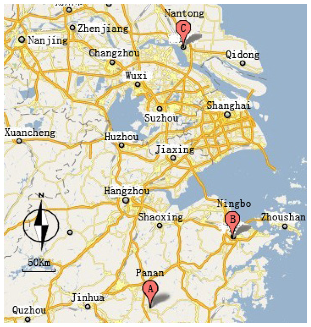 The most representative of three producing areas of F. thunbergii were chosen for the research: the Nantong, Ningbo and Panan regions as the Ningbo region in Zhejiang province is an authentic Dao-di producing area; the Panan region in Zhejiang province as a non-authentic Dao-di producing area; and the Nantong region in Jiangsu province also as a non-authentic Dao-di producing area but in a different province. The main climate conditions in these regions are as follows: the annual temperature ranged from −7 to 38 °C; the annual rainfall is 1300–1450 mm; the altitude is 300–700 m and yellow soil. Soil samples were taken in April 2009 from the rhizosphere and bulk soil of three regions, the locations of which are shown in Figure 5. At least fifteen plants of F. thunbergiiwere randomly selected from five spots in each sampling site and the roots were shaken gently to separate soil not tightly adhering to the roots for each replica. The soil in 10–15 cm depth that remained attached to the roots was considered as rhizosphere soil and that the soil in 10–15 cm depth in which F. thunbergii had no plants growing nearby, was bulk soil []. Each sample was taken in triplicate. Part of the samples were kept moist in the dark at −20 °C for microbial diversity analysis and at 4 °C to assess soil enzyme activity. The remaining soil was air-dried at ambient temperature, crushed and sieved through a 0.2 mm mesh for analysis of pH, organic matter and element contents.