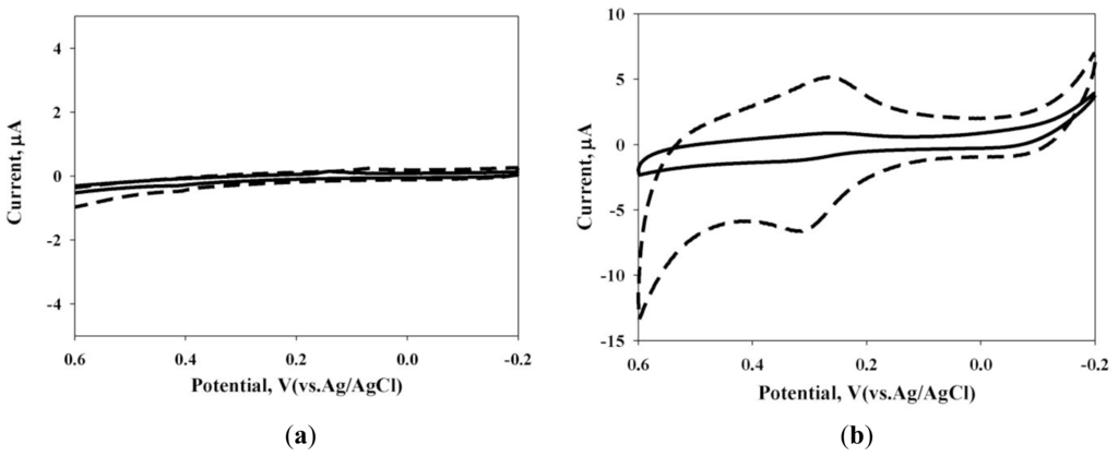 Cyclic voltammograms of SPE (a) and CoPc/SPE (containing 180 μg CoPc) (b) electrode with (dotted line) and without (solid line) 64 mg·L−1 of sulfur in a 0.01 mol·L−1 NaOH solution at sweep potential range −0.2 V to 0.6 V, v = 50 mV·s−1.