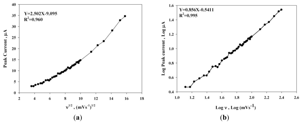 Typical plots of anodic peak current (ipa) versus v1/2 (a) and a double logarithmic of the anodic peak current (ipa) versus v (b).