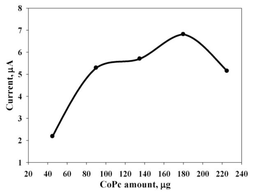 Varying amounts of the CoPc on the electrode surface with 64 mg·L−1 of sulfur in a 0.01 mol·L−1 NaOH solution at sweeping potential −0.2 V to 0.6 V, v = 50 mV·s−1.