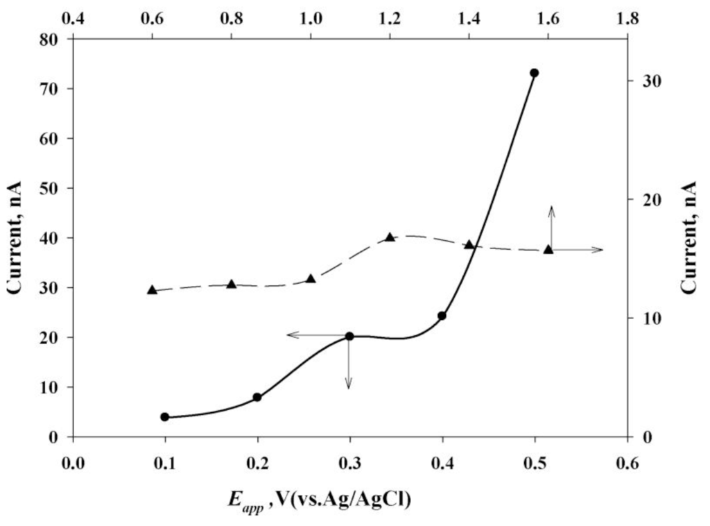 The analytical response of the CoPc towards the sulfur oxidation reaction was explored further using FIA coupled with a wall-jet electrode system, to increase sensitivity. Using this method the selective determining of sulfur in cosmetics in the presence of other ingredients is feasible. An initial optimization experiment was conducted for 64 mg·L−1 of sulfur under various working parameters, such as applied potential (Eapp), flow rates (Hf), and various NaOH concentrations. The effect of applied potential (Eapp) was examined by fixing Hf = 1.2 mL·min−1, and an optimized response was obtained by increasing the potential from 0.1 V to 0.5 V (versus Ag/AgCl), as shown in Figure 4.