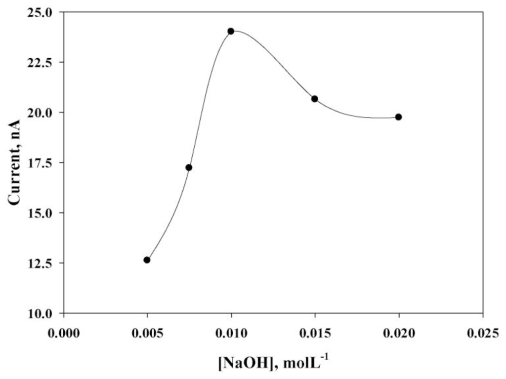This study noted that the sulfur detection current increased with the increase in applied potential (Eapp). Beyond this potential (0.3 V), the current was unstable due to the oxygen evolution reaction activated at 0.3 V, which may complicate the sulfur oxidation reaction by reflecting a poor stability of 3.95% at 0.3 V, 8.16% at 0.4 V and 10.92% at 0.5 V. The hydrodynamic parameters of the flow rate (Hf) were then optimized using a detection potential of 0.3 V, as suggested in earlier studies. Considering the enhanced peak current and R.S.D value in analytical application, a uniform Hf of 1.2 mL·min−1 was chosen for additional FIA experiments. A lower FIA detecting current signal was also observed before and after a Hf of 1.2 mL·min−1. These observations indicate that the mechanistic pathways can compete with each other within the working Hf window, and one of the favorable mechanisms may help to achieve the maximum current value of 0.3 V. Additionally, the effect of a NaOH (0.005–0.020 mol·L−1) concentration on the sulfur oxidation reaction was also studied, as shown in Figure 5. At higher concentrations of NaOH, the current was reduced when the oxygen revolution reaction at the CoPc/SPE could affect the sulfur oxidation mechanism. The optimized conditions of Hf = 1.2 mL·min−1, Eapp = 0.3 V and 0.010 mol·L−1 NaOH electrolytes were used in subsequent FIA studies.