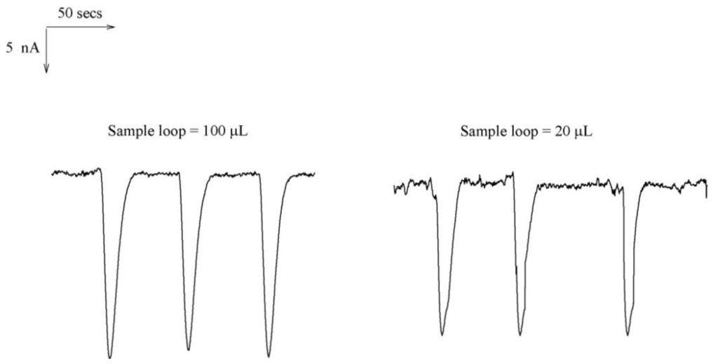 For a standard sample of 64 mg·L−1 sulfur at 0.01 mol·L−1 NaOH, two loops with loop volumes of 100 μL and 20 μL have been applied under the flow rate of 1.2 mL·min−1 and a applied potential of 0.3 V (versus Ag/AgCl). Their response currents are 19 nA and 16 nA, respectively. Results are shown in Figure 6.