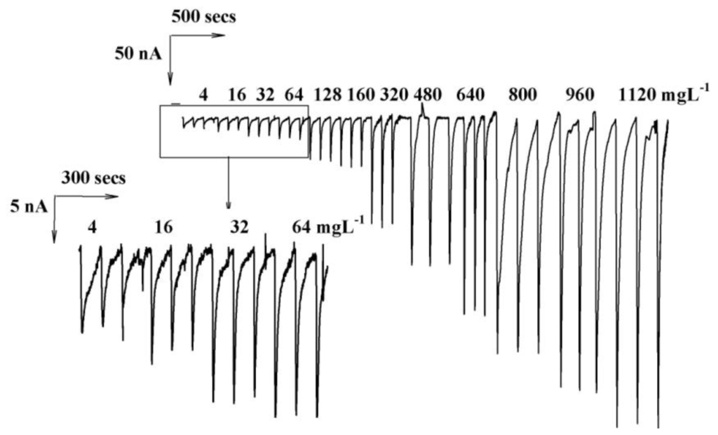 No obvious discrepancy in sensitivity between both loop volumes happens. When the sample loop volume is increased, both the peak width and analytical time are increased. Therefore, 20 μL is a suitable loop volume for this study. Figure 7 displays the typical FIA responses observed from 4 to 1120 mg·L−1 under optimized conditions. The linear concentration measured up to 1120 mg·L−1, with a linear equation and regression coefficient of Y = 8.7316 + 0.272X and 0.9985, respectively (Figure 7). Twelve continuous injections of 64 and 480 mg·L−1 sulfur resulted in an R.S.D of 3.60% and 3.52% indicating the detection limit (DL, S/N = 3) of 0.325 mg·L−1. Overall, the system reproducibility and stability are excellent and disposable electrodes can be used for bulk preparation and routine analytical assays.
